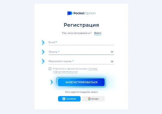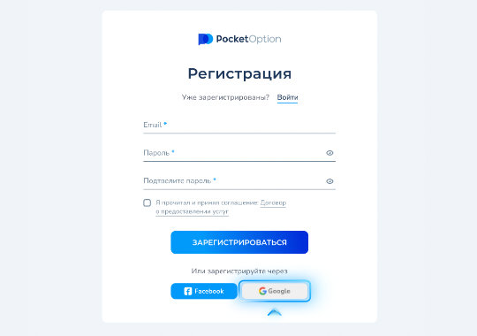 Выберите наиболее удобный вариант и приступайте к регистрации счета. Обратите внимание, что если вы зарегистрируетесь через facebook/google, вам может потребоваться сбросить пароль здесь, чтобы войти в вашу учетную запись Pocket Option с помощью адреса электронной почты.