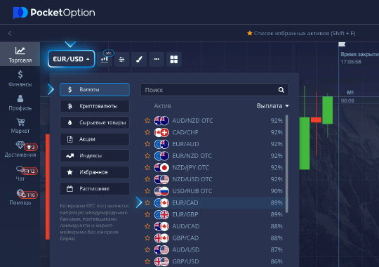 Торговля на Pocket Option очень проста. Вам понадобится всего несколько вещей, чтобы легко ориентироваться в торговом интерфейсе. Начните с выбора типа торговли (быстрая, цифровая или Forex MT5), затем выберите предпочтительный торговый актив (валюта, акции, товары и т.д.) и установите тип графика (область, линия, свечи, бары, хейкен аши).