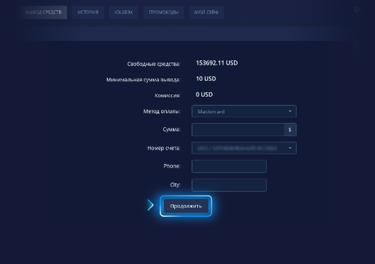 Если у вас нет активных бонусов на депозит, вы можете вывести баланс вашего торгового счета в любое время без каких-либо ограничений по сумме. Если у вас есть активный бонус на депозит, сумма бонуса будет удержана с вашего баланса, если бонус не отработан. Просмотреть информацию о бонусах и прогрессе отработки в разделе Промокоды.